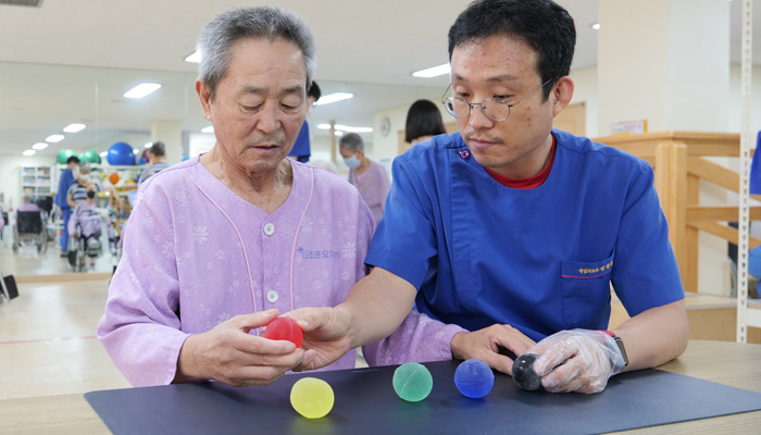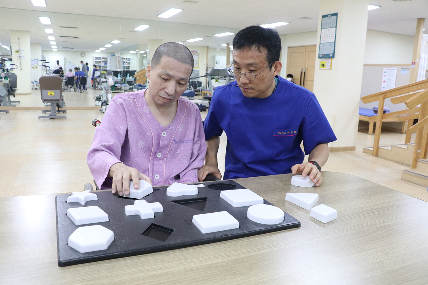 질병이나 사고로 인해서 신체적, 정신적으로 손상을 받은 환자에게 다양한 신체적 기능과 일상에서 필요한 기술들을 훈련해 삶을 질적으로 향상시키기 위한 치료로써 근육의 힘과 조절 능력을 길러주고, 관절의 변형과 구축을 예방 및 증진시켜주며 눈과 손의 조화로운 운동이 가능하도록 손의 민첩성과 지구력을 길러주는 치료입니다.